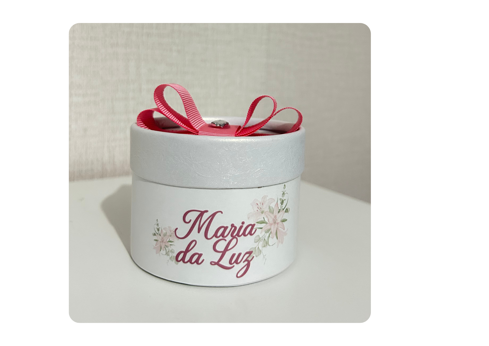 Com acabamento elegante, tampa com textura suave, laço em fita de cetim e pedraria central, ela transmite cuidado e sofisticação já no primeiro olhar.